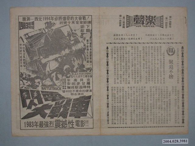 1.臺北樂聲戲院1982年提供觀眾的電影本事,雙面印刷。一面是《緊追不捨》的電影本事,描述兩位特務一路追查可疑原子爐故事的動作片。其上方空白處有反共防諜標語,右側載明「中華民國七十一年十二月十一日起獻映」。而其左方則為下期放映紐西蘭動作片《閃電火戰車》(Battletrunk/ Warlords of the 21st Century)的電影廣告及劇照。另面為下期放映的美國片《日本小亡命》(Escapade in Japan)廣告及劇照,強調該片為「繼金馬獎國際影展觀摩會日片大轟動後堂堂又推出一大巨製!」是一部描述美日兩小可愛逃亡日本所發生的趣味感人故事的劇情片。