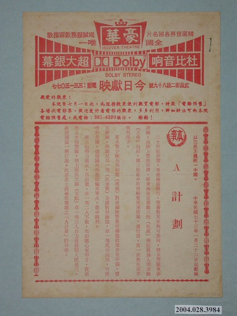 1.臺北豪華戲院1984年提供觀眾的電影本事,雙面印刷。一面是《A計畫》的電影本事,該片由成龍執導,由成龍、洪金寶和元彪等主演,描述20世紀初香港水師警隊剿滅盛行海盜的故事。右側另載明「中華民國七十三年一月二十六日起獻映」。而另面為下期放映的美國片《聖保羅砲艇》(The Sand Pebbles)廣告及劇照,強調該片為「大導演大明星大製作」,是一部由羅勃懷斯執導,史提夫麥昆、甘蒂絲柏根、李察艾登布祿等聯合主演,充滿烽火陰謀戰爭及悲壯感人愛情故事的劇情片。