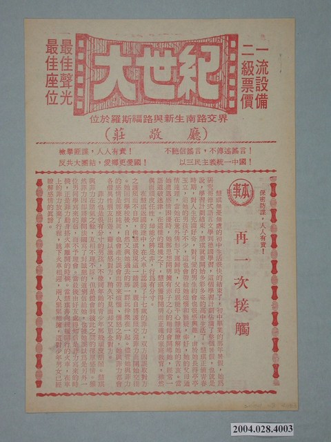 1.臺北大世紀戲院1980年代提供觀眾的電影本事,雙面印刷。一面為《再一次接觸》(La boum 2)電影本事,該片為描述15歲的青春少女與少男青春戀愛的記事,是一部由知名女星蘇菲瑪索主演的法國浪漫喜劇。另面為下期上映《帶劍的小孩》的電影劇照及文案廣告,該片為1983年新藝城電影公司出品,龍祥影業發行,柯一正執導,張艾嘉、艾迪、梁修身、王道等主演的臺灣劇情片,描述從一樁綁架案所揭開的一連串社會倫理關係的故事。