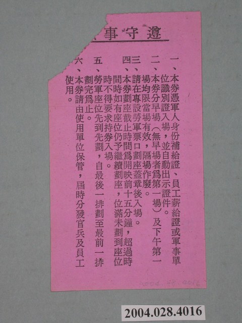 1.本物件為戲院票券,為紙質文物,共有一張。該票券底色為粉紅色,為勞軍入場券,右上角有撕毀痕跡。票券正面可見「東南亞戲...」、「勞軍入場券」、「No 070018」、「地點:羅斯福路四段一三六巷三號」、「日期:75年7月13日」、「下午第一場」、「樓上下 4排13號」、「中華民國軍人之友社 台北市軍人服務站印製」字樣。票券中間蓋有紅色圓印,可見「75.7.13」、「樓壹」字樣。背面可見遵守事項說明,共有六點。主要說明票券使用身分及相關規則。