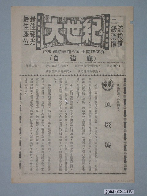 1.臺北大世紀戲院1980年代提供觀眾的電影本事,雙面印刷。一面為《熄燈號》(Taps)電影本事,主要描述歷史悠久的碉堡山預校大學面臨拆除命軍,一群熱情富戰鬥力的軍校生欲保護校土所發生的一連串故事。該片由美國知名影星喬治史考特、提姆西赫頓、湯姆克魯斯、西恩潘等主演。另面則為下期上映的《馬拉松人》(Marathon Man)的電影劇照及文案廣告,該片為1976年由金獎導演約翰史勒辛格執導,達斯汀荷(霍)夫曼、勞倫斯奧立(利)佛等主演的懸疑驚悚片,描述一名研究生在跑馬拉松時無意捲入納粹逃犯的殺戮事件。