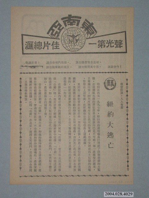 1.臺北東南亞戲院1980年代提供觀眾的電影本事。一面為英語片《紐約大逃亡》(Escape from New York)的電影本事,描述1997年紐約曼哈頓成為一座大型監獄,不巧美國總統飛機失事於此遭綁架,一位重刑犯被要求將功贖罪救回總統的故事。另面則是下期上映的美國片《四季》(The Four Seasons)的電影劇照及文案廣告,該片為1981年由環球電影公司出品,馬丁布雷曼製片,描述三對夫妻七人行之間所發生既諷刺人性、又幽默有趣的故事,榮獲1982年第39屆金球獎4項提名。