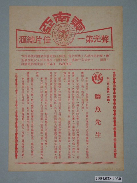 1.臺北東南亞戲院1980年代提供觀眾的電影本事。一面為澳洲片《鱷魚先生》(Crocodile Dundee)的電影本事,描述一位美國女記者前往澳洲採訪粗獷瘋狂的獵鱷先生,並邀請他來紐約造成一連串爆笑旋風的故事。另面則是下期上映的香港片《省港旗兵續集》的電影劇照及文案廣告,該片為1987年由香港嘉禾電影有限公司、麥當雄製作有限公司聯合出品,麥當雄監製,麥當傑執導,萬梓良、王小鳳領銜主演的警匪片。