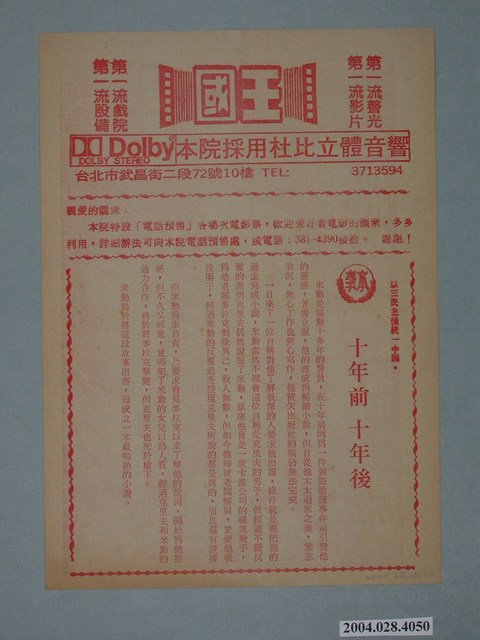 1.臺北國王戲院1980、1990年代提供觀眾的電影本事,雙面印刷。二面均為《十年前十年後》(Best Seller)電影本事及廣告,該片描述一位寫作犯罪小說的警員及一個職業殺手,兩人一起攜手調查事件證據及真相,並促使成為一本暢銷書誕生的故事,是一部由詹姆斯伍德、布萊恩狄尼主演的動作片。