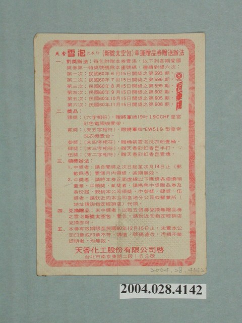 1.本物件為天香雪泡洗衣粉幸運贈品券,為紙質,為長方形形式,有花紋邊框圍繞正面四周,其上方為贈品券名「天香雪泡洗衣粉(新號太空包)」紅色字樣與「幸運贈品券」白色字樣,其餘內容包含編號為NO350803,簡述其獎品兌換,並有「第一特獎位數號碼」、「領獎人性名」「簽章」、「住址」、「國民身分證統一號碼」等空格須填寫;背面則為天香雪泡洗衣粉(新號太空包)幸運贈品券贈送辦法,內容包含兌獎辦法、獎品、領獎辦法、兌換贈品即本券有效期限之注意事項。