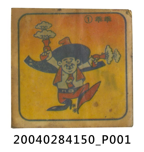 1.臺灣乖乖股份有限公司零食附贈貼紙,正方形單面,底色為橘色,有一正方形黑色邊框,中間則是乖乖經典角色,拿著槍往上一噴,右上方則註記「乖乖」字眼史豔文布袋戲中的哈賣。2.乖乖為1968年東大聯合股份有限公司所推出的產品,以黃俊雄大受歡迎的史豔文布袋戲中人物「哈嘜二齒」為原形加上墨西哥大圓帽為商標,並於包裝內附贈一小玩具。推此貼紙推測為乖乖零食附贈的貼紙禮物。