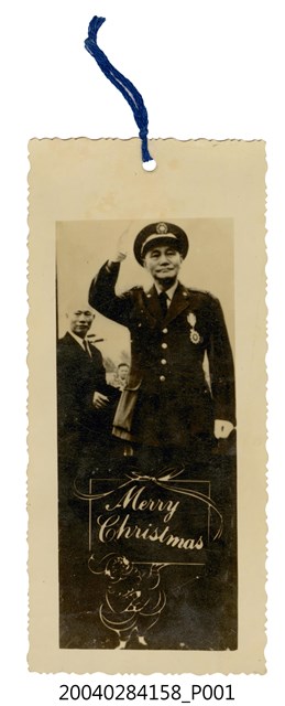 此物件為政治宣傳書籤,書籤印有前總統蔣中正之相片,下方印有‘Merry Christmas’字樣。 此件文物的主要人物為蔣中正,生於1887年10月31日,浙江奉化人,原名瑞元,後改名中正,字介石,擔任中華民國自行憲開始的第一至第五任總統,並連續擔任中國國民黨總裁。蔣中正早年考送日本振武學校,並在1907年加入中國同盟會,其後參加孫文的中華革命黨,在「六一六事變」後成為孫文心腹,並且參與創建黃埔軍校。孫文死後,蔣中正擔任北伐總司令,率領國民革命軍成功北伐,領有中國大部份領土,後於1937年率軍對抗日軍侵略,並獲得勝利。1949年,中國國民黨在第二次國共內戰中失利,蔣中正和中華民國政府撤退臺灣,在臺發布《動員戡亂臨時條款》,實行長達38年的戒嚴令。臺灣社會在戒嚴時期經歷的權威專制,史稱「白色恐怖」。蔣中正於1975年4月5日去逝,其對於中國近代史以及東亞史發展有著深刻影響。
