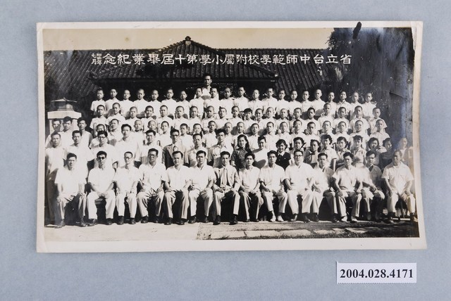 1.本文物為「省立臺中師範學校附屬小學第10屆畢業紀念」,照片上方可見「省立台中師範學校附屬小學第十屆畢業紀念」、「四四年七月」字樣。照片內主要呈現5排,第1、2排應為教師,第1排為坐姿、第2排為站姿。第3、4、5排應為學生,呈現站姿。2.省立臺中師範學校附屬小學即是現今國立臺中教育大學附設實驗國民小學,創立於昭和3年(1928)4月,時稱「臺灣總督府臺中師範學校附屬公學校」。國民政府接收後,改為「臺灣省立臺中師範學校附屬第一國民學校」,民國94年配合臺中師範學院升格,該校改稱為「國立臺中教育大學附設實