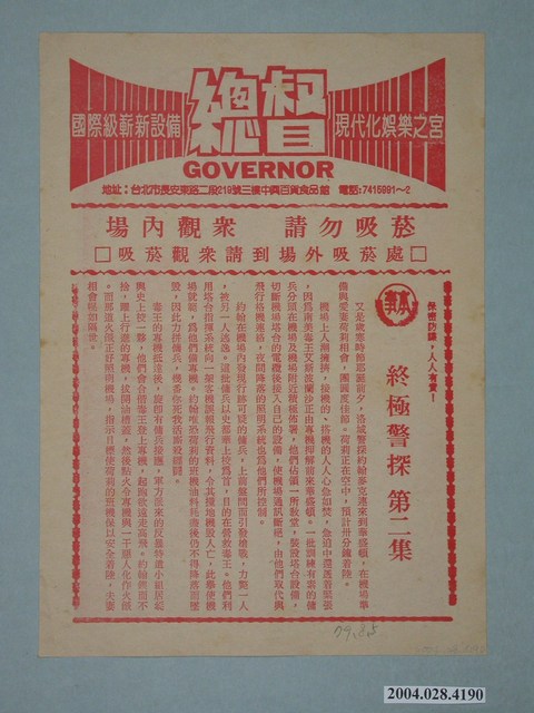 1.臺北總督戲院1990年提供觀眾的電影本事,雙面印刷。一面為《終極警探第二集》(Die Hard 2)電影本事,該片布魯斯威利主演,描述美國洛城警探在華盛機場成功緝毒的故事。下方寫有「79.8.5」鉛筆字跡。另面為下期上映的《狄克崔西》(Dick Tracy)的電影劇照及文案廣告,該片為1990年出品的美國片,由華倫比提、瑪丹娜、格蘭妮赫德莉、查理科斯莫等主演,描述一位智勇雙全、槍法奇快神準的天才警探的故事。
