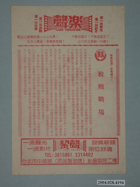 1.臺北樂聲戲院1984、1985年提供觀眾的電影本事,雙面印刷。二面均是英國片《殺戮戰場》(The Killing Fields)的電影本事與廣告,該片描述1973年一位紐約時報記者前往高棉(柬埔寨)採訪赤柬政權進行殺戮及內戰的故事,是一部由羅蘭約夫執導,山姆華特斯頓、吳漢等主演的戰爭劇情片。廣告強調該片榮獲1985年第57屆奧斯卡金像獎7項提名、英國電影藝術學院最佳影片獎等8項大獎。
