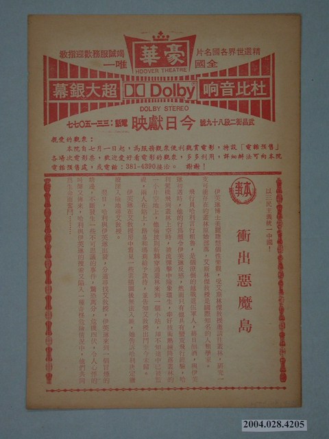 1.臺北豪華戲院1980年代提供觀眾的電影本事。一面為《衝出惡魔島》的電影本事,該片描述一位女博士與男飛行駕駛員前往原始叢林部落進行研究時發生的一連串驚險故事。另面則是下期上映的美國片《閃舞》的(Flashdance)電影劇照及文案廣告,該片是1983年由派拉蒙公司出品,珍妮佛貝兒主演,描述一位獻身藝術的年輕天才女舞者的奮鬥故事。