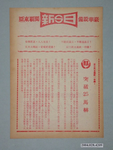 1.臺北日新戲院1980年代提供觀眾的電影本事,雙面印刷。一面為美國片《突破25馬赫》(SpaceCamp)電影本事,描述一群青少年學生參加美國太空總署主辦的太空夏令營所發生的一連串驚險趣味故事。另面則為下期上映的《教會》(The Mission)的電影劇照及文案廣告,強調該片榮獲坎城影展最佳影片,為1986年由《殺戮戰場》導演羅蘭傑飛執導,勞勃狄尼洛、傑洛米埃恩等主演,描述18世紀天主教耶穌會赴南美傳教的故事。