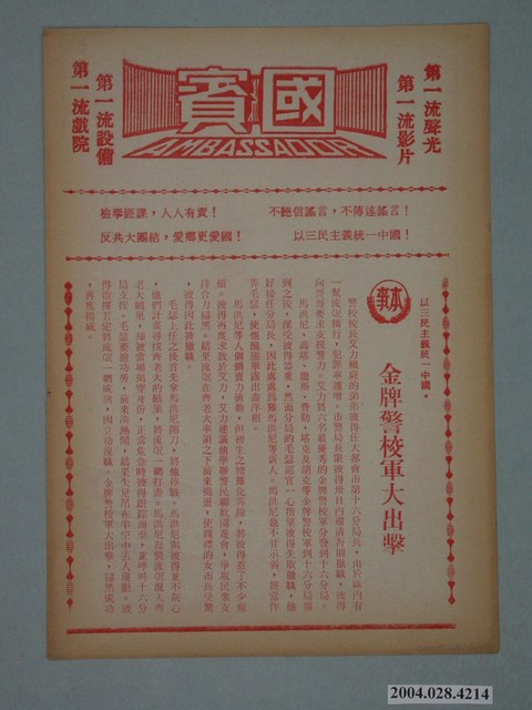 1.臺北國賓戲院1980年代提供觀眾的電影本事,雙面印刷。一面為美國片《金牌警校軍大出擊》(Police Academy 2: Their First Assignment)的電影本事,描述由於一群流氓橫行市區,六名年輕的金牌警校軍被分發到市警局成功掃黑的故事。該片為「金牌警校軍」系列喜劇電影的第二集。另面則是下期上映的美國片《地獄來的訪客》的電影劇照及文案廣告,該片為1985年由《片甲不留》男主角勞勃甘堤、《魔鬼終結者》女星黛博拉吉夫娜主演的暴力動作片。