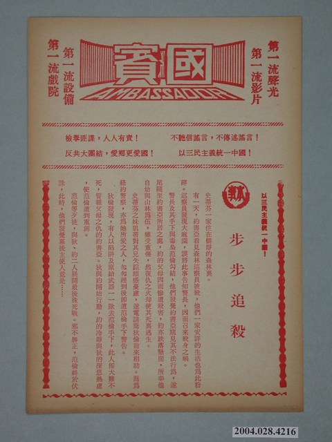 1.臺北國賓戲院1980年代提供觀眾的電影本事,雙面印刷。一面為《步步追殺》的電影本事,描述原本一居住在森林的寧靜家庭因一毒梟案而破碎,促使男孩展開一連串復仇行動的故事。另面則是下期上映的美國片《悍妞萬里追》(Outrageous Fortune)的電影劇照及文案廣告,該片為1987年由亞瑟希爾執導,莎莉朗、貝蒂蜜勒主演,充滿緊張刺激及火爆風趣的喜劇片。