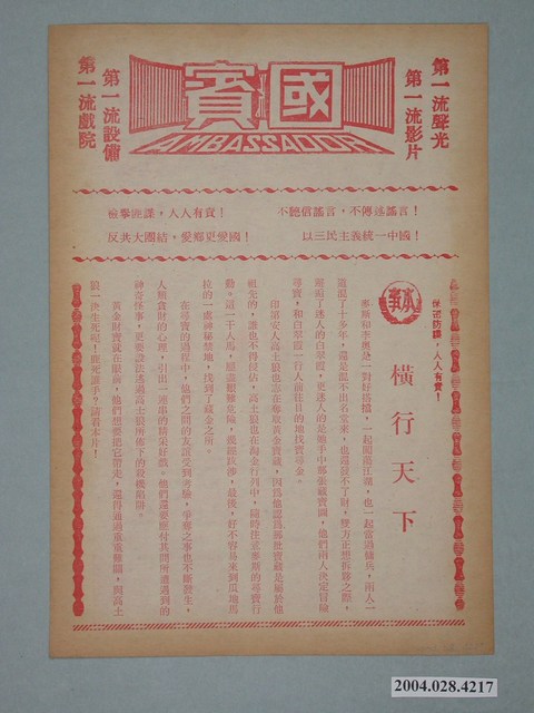 1.臺北國賓戲院1980年代提供觀眾的電影本事,雙面印刷。二面均為美國片《橫行天下》(Firewalker)的電影本事與廣告,該片描述一對混行闖盪江湖的好搭檔與一位迷人女子共同前往冒險尋寶的故事,是部1986年由李湯普遜執導,羅禮士、路易士葛塞主演的冒險喜劇。