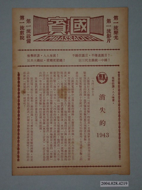 1.臺北國賓戲院1980年代提供觀眾的電影本事,雙面印刷。一面為美國片《消失的1943》(The Philadelphia Experiment)的電影本事,描述1943年10月美國海軍部進行的「費城實驗」所引發兩位船員穿越到1984年未來的神祕科幻故事。另面則是澳洲片《衝鋒飛車隊第二集》(Mad Max 2)的電影劇照及文案廣告,該片為1981年由華納電影公司發行,梅爾吉勃遜、蒂娜透納等主演的飛車動作片。