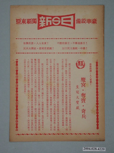 1.臺北日新戲院1980年代提供觀眾的電影本事,雙面印刷。一面為《魔宮.奪寶.奇兵:皇冠大寶藏》(El tesoro de las cuatro coronas/ Treasure of the Four Crowns)電影本事,描述一位身手矯健的探險家一路化險為夷尋找魔鑰、解開皇冠魔力的冒險故事。另面則為下期上映的美國片《黑獄霸王花》(Certain Fury)的電影劇照及文案廣告,該片由泰坦歐尼爾、彼得方達等主演,是一部描述主要描述兩位女嫌犯一路逃脫警方、前男友等人追捕的故事。