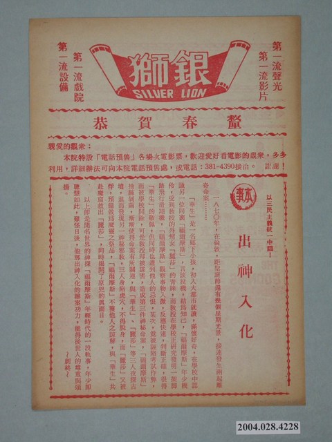1.臺北銀獅戲院1984年提供觀眾的電影本事,雙面印刷。一面是美國片《出神入化》(Young Sherlock Holmes)的電影本事,該片主要描述在1870年倫敦,未來將聞名世界的名偵探福爾摩斯在其年輕時,與好友華生及麗莎一同調查辦案的故事。另面則是下期放映的美國片《七寶奇謀》(The Goonies)之廣告及劇照,該片由華納電影公司出品,史蒂芬史匹柏製片,李察唐納執導,關繼威等主演,是一部描述一群孩子前往探險尋寶以捍衛家園的冒險故事。