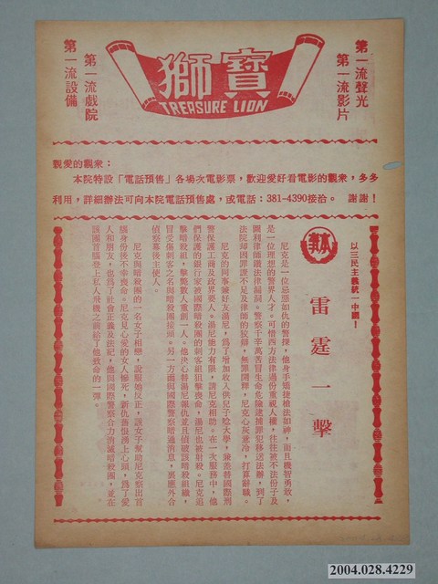 1.臺北寶獅戲院1980年代提供觀眾的電影本事,雙面印刷。一面是《雷霆一擊》的電影本事,該片是描述一名機智勇敢、嫉惡如仇的警探在經歷好友與情人遭暗殺後致力復仇的故事。另面則是下期放映的日本片《聯合艦隊》廣告及劇照,該片1981年由東寶電影公司出品,松林宗惠執導,古手川祐子領銜主演的歷史戰爭片。