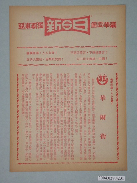 1.臺北日新戲院1988年提供觀眾的電影本事,雙面印刷。一面為《華爾街》(Wall Street)電影本事,描述一位年輕證券經紀人不顧一切想成功,並決心跟隨一個不擇手段的貪婪前輩學習掠奪、鑽法律漏洞的故事。另面則為下期上映的《幽幻戰士》(The Wraith)的電影劇照及文案廣告,該片為1986年出品的美國超時空科幻片,由史蒂芬史匹柏特技小組製作,查理辛領銜主演,描述一位無人能擋的幽靈車手對暴徒們展開復仇的故事。