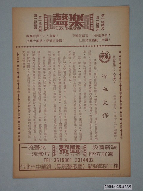 1.臺北樂聲戲院1983年提供觀眾的電影本事,雙面印刷。一面是義大利片《冷血太保》(1990: I guerrieri del Bronx/ 1990: The Bronx Warriors)的電影本事,描述在未來的1990年美國南區形成一座無形監獄,裡頭並充滿了罪犯及暴力的故事。另面則是下期放映的英語片《把命留下》(There Was a Little Girl)廣告及劇照,該片是由亞遜尼帝斯執導,翠西伊娃莉、丹尼斯勞勃森、摩甘海蒂等主演的驚悚片。