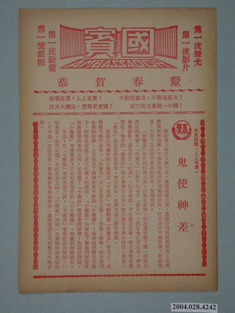 1.臺北國賓戲院1988年提供觀眾的電影本事,雙面印刷。一面為美國電影《鬼使神差》(*batteries not included)的電影本事,該片描述美國紐約第八街的建商為賺取暴利大興土木、並強制驅趕居民,引起五位抵死不從居民獲得小精靈協助抗暴的故事。另面則是下期上映的《1987大懸案》(Manhunter)的電影劇照及文案廣告,為1986年美國出品的一部犯罪驚悚片。