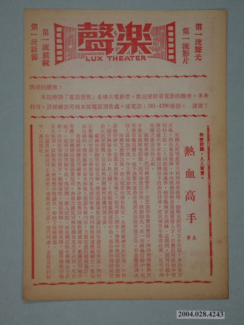 1.臺北樂聲戲院1980年代提供觀眾的電影本事,雙面印刷。一面是美國片《熱血高手》(Above the Law)的電影本事,描述一位美國藝高膽大的芝加哥警探,身經越戰及中情局之背景訓練,一路破解毒品案牽扯掛勾中情局黑幕的故事,由史蒂芬席格(Steven Seagal)主演。另面則是下期放映的美國片《不要逼她開火》廣告及劇照,該片是描述美國陸戰隊女隊員的故事。
