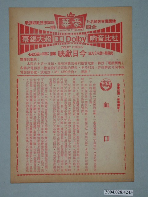 1.臺北豪華戲院1980年代提供觀眾的電影本事。二面均為美國片《血口》(Prime Cut)的電影本事與廣告,該片描述一名美國芝加哥警探前往南部肯薩斯州的一座農場,調查一座食品廠裡所隱藏的不法勾當,由西西史派克(Sissy Spacek)、李馬文(Lee Marvin)領銜主演,是一部描述為營救雛妓所發火拼事件的動作鉅片。
