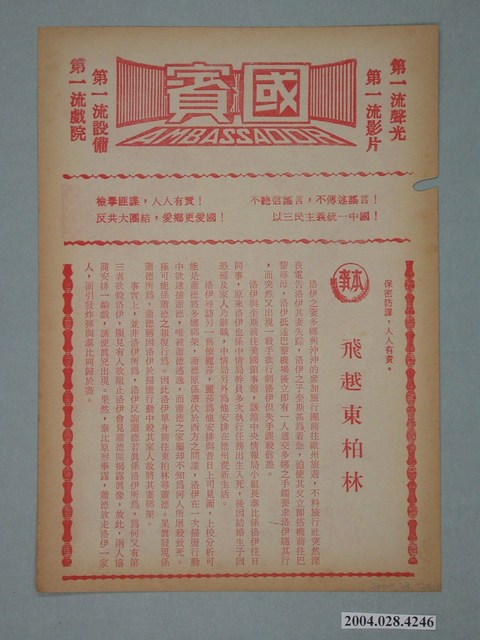 1.臺北國賓戲院1986年提供觀眾的電影本事,雙面印刷。一面為美國電影《飛越東柏林》(Target)的電影本事,該片描述一位美國女人前往歐洲旅遊時被綁架,其曾在中情局工作的丈夫偕同兒子前往巴黎搶救時所發生的驚險故事,由麥特狄倫(Matt Dillon)、金哈克曼(Gene Hackman)主演。另面則是下期上映的《就等這一天》(No Retreat, No Surrender)的電影劇照及文案廣告,該片由元奎執導,寇特麥肯尼(Kurt McKinney)、強克范達梅(Jean-Claude Van Damme)主演,是一部向李小龍致敬的美國動作片。