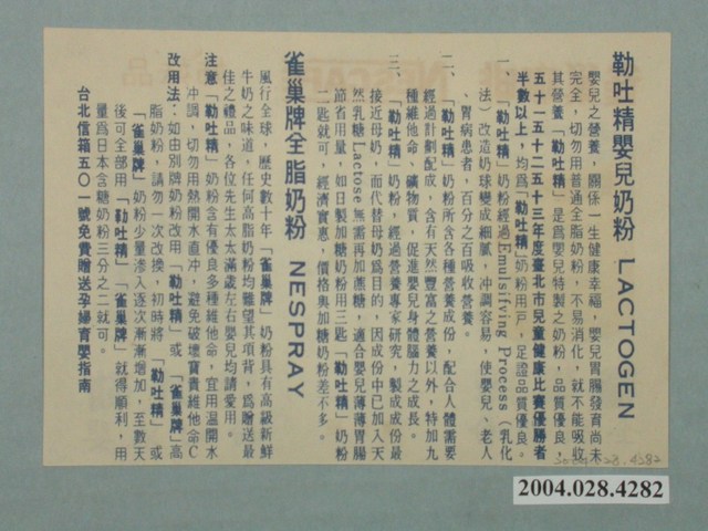 本件雀巢公司製雀巢牌全脂奶粉與精吐勒嬰兒奶粉廣告單,為紙質宣傳印刷品,做雙面印刷,正面為彩色印刷,背面則作單色印刷,呈長12.9公分,寬9公分之橫式長方形。正面版面以白色為底,上端以紅色印有「雀巢咖啡姊妹品」與雀巢咖啡之商標文字。版面左右側作對稱樣式,分別印有鐵罐奶粉包裝,左側為黃底藍色印刷包裝,印有「NESPRAY」、「FULL CREAM 」、「POWDERED MILK 」,下端則印有藍色「雀巢牌全脂奶粉」商品名稱。版面右側為藍底白字包裝,印有「LACTOGEN」,下端則印有藍色「勒吐精嬰兒奶粉」商品名稱。版面中段則印友直式「雀巢公司 榮譽出品」與公司商標。背面版面則作藍色印刷,正面兩種奶粉商品作文字介紹,其中包含商品特色與使用方式。