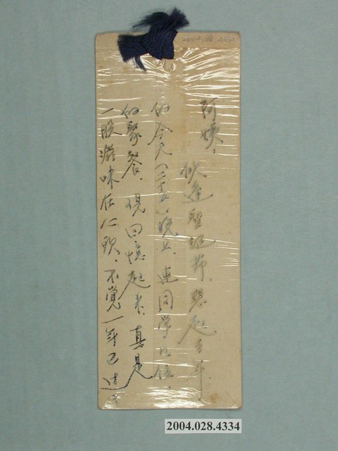 本件是蝴蝶書籤,正面有兩隻蝴蝶、一片樹葉,下方蓋「臺灣名產」四字。背面是致贈者給其阿姨的一段話。書籤是長方形薄片,常用材料有紙張、塑膠、金屬等等。可以夾入書籍的某頁,以方便查閱。