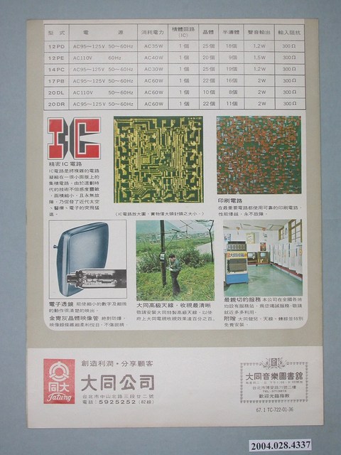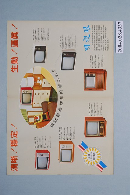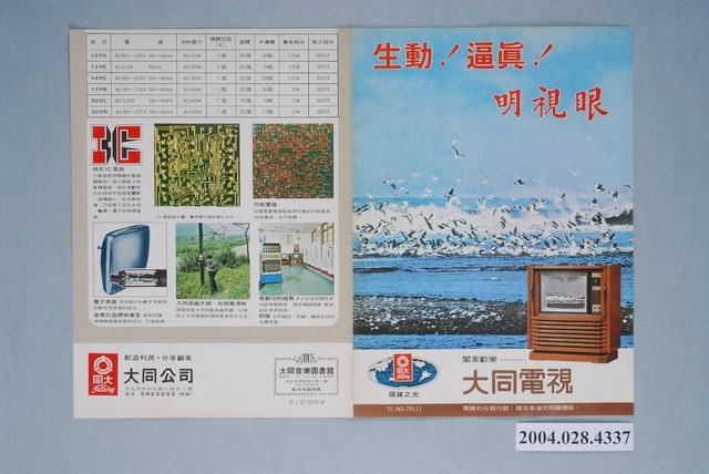 1.本物件為大同電視廣告單,紙製材質,廣告單邊緣有褪色現象。廣告單主視覺為鳥類在海邊拍打飛舞的畫面以及大同公司電視產品。廣告單正面上方字樣為「生動」、「逼真」、「明視眼」;下方字樣為「闔家歡樂」、「大同電視」以及該電視型號,其左側有大同公司商標。廣告單背面為電視相關電路等介紹,下方可見大同公司商標、地址及電話。廣告單內頁為各電視型號之介紹。
