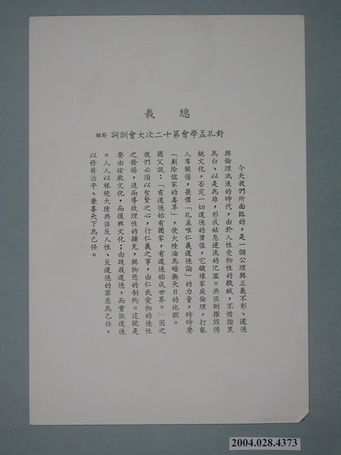 此文宣生產於蔣中正逝世後,用以形塑偉人形象並緬懷其功績。文宣的其中一面為蔣中正於1972年4月17在孔孟學會第十二次會員大會書面致詞之節錄。孔孟學會於1960年成立的非營利社會團體,目的是「闡揚孔孟學説,恢弘倫理道德」,孔孟學會之運作呼應了當時推動的「反共」政策。 蔣中正的形象在臺灣以各種方式塑造起來,如建立人像、於重要場域懸掛照片、加入課程教育、創作歌曲、道路命名甚至於制定節日,並且讓蔣中正、蔣經國統領的國民黨政府鞏固統治。對此民間也發出反對的聲音,如雷震創立的《自由中國》於1956年10月31日出版的「祝壽專號」發出社論認為「蔣公」應該卸下大任,設立繼任人才的選拔方式以及內閣制的確立,應作「無智、無能、無為」的元首,而在雷震的私人日記中則有對「蔣公華誕」這樣領袖崇拜的行為進行批判。(周俊宇。2008。467-471)。