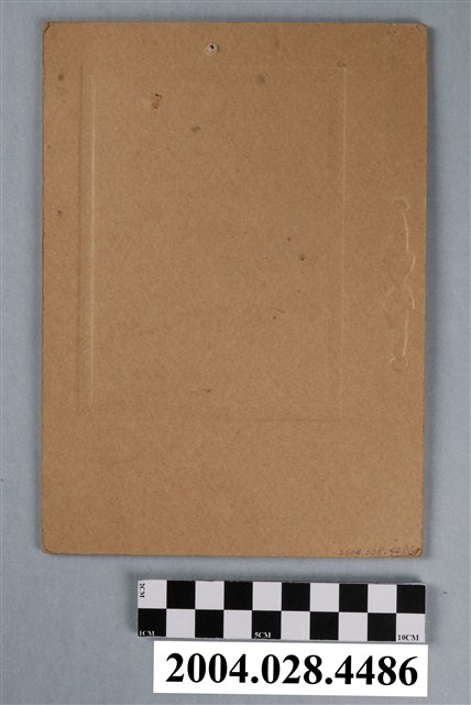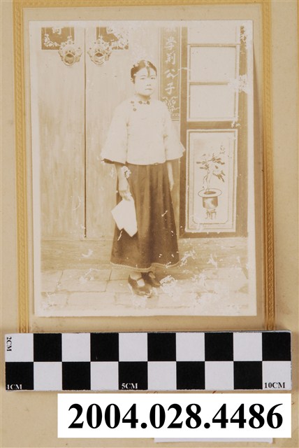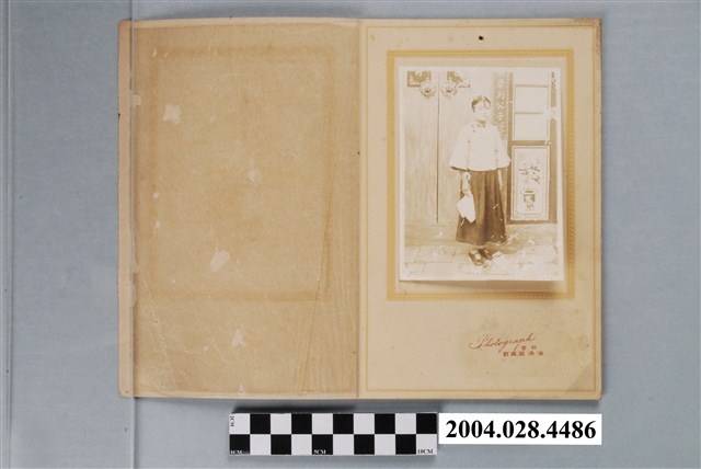 1.本物件為新營海清寫真館拍攝女子手持手帕照片,本物件照片由一褐色紙板夾著,物件畫面中有一女子右手拿著手帕站在門口,門上有門環及春聯,照片下方有「新營海清寫真館」字樣。