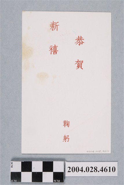 1.香港電影明星林黛彩色半身祝賀卡片,直式雙面,本名程月如,正片背景為淺淺的藍色帶著夢幻,林黛頭髮後方則點綴鮮紅色的圓珠,穿著一件藍色、朱紅、金色漸層配色的無袖禮服,她雖側身臉部卻面向前方,露齒燦笑,正面右邊邊緣則有黃色髒污,背面註記紅字「恭賀新禧,鞠躬」,左邊版面明顯有點黃漬。2.林黛活躍於1953-1964年代,曾參與過《貂蟬》、《不了情》、《千嬌百媚》、《江山美人》等,也榮獲過亞太影后。