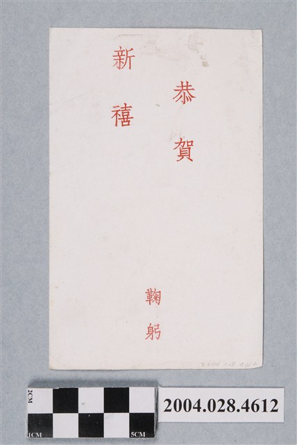 1.香港電影明星尤敏彩色半身祝賀卡片,直式雙面,本名畢玉儀,她身穿一件橘紅色的立領旗袍,斜躺在一床繡有花紋的躺椅上,左手頂住額頭臉頰,右手帶著雅緻的手錶放置左手手臂上,她一抹紅唇微微笑著,眼神往上凝視,看起來典雅可愛,正片有些折痕,多位於下方與邊緣,存放較久因此有點褪色,背面底色全白,註記「恭賀新禧,鞠躬」紅色字樣,上方有點髒污,狀況尚可。2.香港明星尤敏活躍於1952-1964年代,因精湛的演技被譽為「香港的珍珠」,代表作有《玉女懷春》、《明天》。