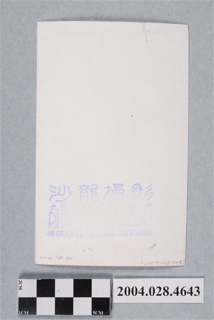 1.香港電影明星張揚黑白半身照片,直式單面,正面背景全白,張揚身穿一件有領針織衣,外罩一件白色毛衣,雙手交叉於胸前,頭髮整齊,眼神直視前方微笑,看起來高大俊朗,下方則留一白色版面,有點灰色髒污,照片背面全白,下方邊緣用藍色墨水蓋印拍攝地點資訊「沙龍攝影,九龍加連威老道四十六號」字樣,下方邊緣有點髒污,但整體狀況良好。2.香港影星張揚活躍於19530-1975年,螢幕形象多溫文儒雅,曾與尤敏、李麗華合作過,代表作有《黑手套》、《星星月亮太陽》。