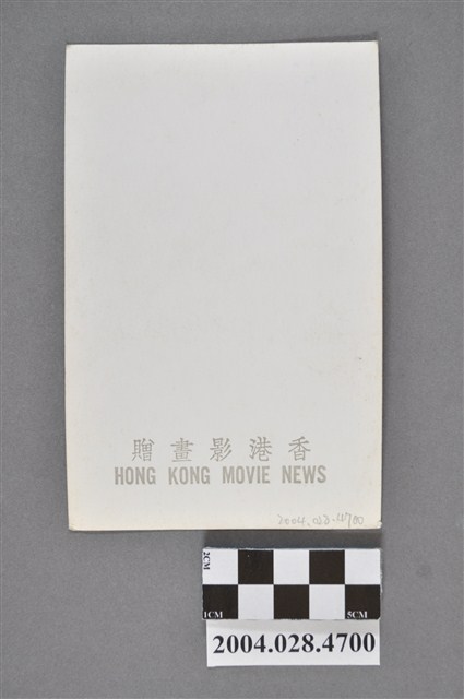 1.香港電影明星胡燕妮大頭黑白贈獎照片,直式單面,構圖較偏,他一頭俏麗短髮,身穿淺格紋洋裝,雙眼直視右前方面露淺淺的微笑,看起來有點淘氣,正面版面保存情況尚可,為她臉頰版面左側有點磨損產生白點,左下角則以藍筆簽親「胡燕妮」,背面全白,為底部用墨水蓋印「香港影畫贈」,整體狀況頗佳。2.此照片為香港影畫報贈獎的照片,取胡燕妮加入邵氏影業1966-1982時期的劇照,為中德混血,以《何日君再來》爆紅,後參與《新不了情》、《殺人玫瑰》等電影。