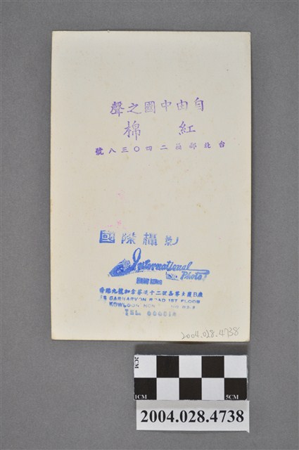 1.香港明星韓燕黑白全身照片,直式單面,她看起來仰躺在一面白色的牆壁上,又或者躺在地上,她身穿一件有著深色葉子花紋的上衣,白色褲子,左手舉起,右手放置腰後,姿勢優雅,及肩的短髮披在後側,眼神瞄向右前方,燦爛微笑,右下方版面則斜斜的使用藍色墨水簽署「韓燕」二字。背面則有兩則蓋印,上方為「自由中國之聲-紅棉-台北郵箱二四O三八號」。下方版面則是「國際攝影」等,此公司位於香港。版面狀況尚佳。2.推測為香港電影明星,因拍攝地點為香港國際攝影公司,因此推測,其餘資訊不詳。