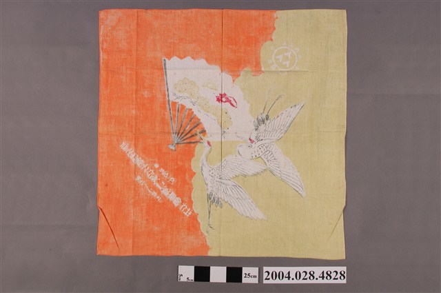 1.本件新竹縣新竹市第二信用合作社布巾以棉布套色印染而成,作單面印染,背面透色,呈長77.3公分,寬78公分之正方形布巾。布巾以方菱形為正面,右半部以橘色為底,左半部以黃色為底,畫面中央以2隻成對飛翔姿態之丹頂鶴為主,右側有敞開之紙扇,扇面以松樹枝葉裝飾。布面上方以圓環形為框,內有3個倒V形箭頭為商標,框外上下端書寫「我為人人」、「人人為我」標語。布面下端則白字橫書「有限□□」、「新竹縣新竹市第二信用合作社」、「電訪一二六號」。2.本件布巾應為新竹縣新竹市第二信用合作社之公關致贈禮品,早期尚未出現塑膠袋或紙袋提拿物品,主要使用此類方形布巾包裹物品,以布巾兩端角綁結後可作提拿使用。
