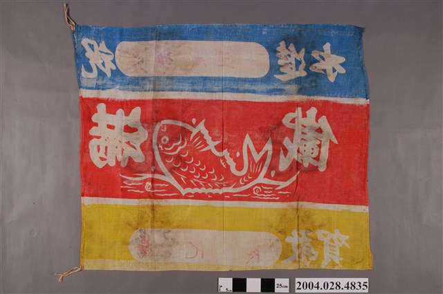 本物件為光華成三號,布條由藍紅黃三色構成,「光華成三號」疑為船隻名稱,為楊化良於光華成三號進水儀式時致贈,中央寫著「滿儎」兩字,中央有一魚隻圖樣。