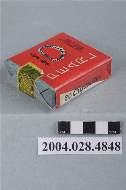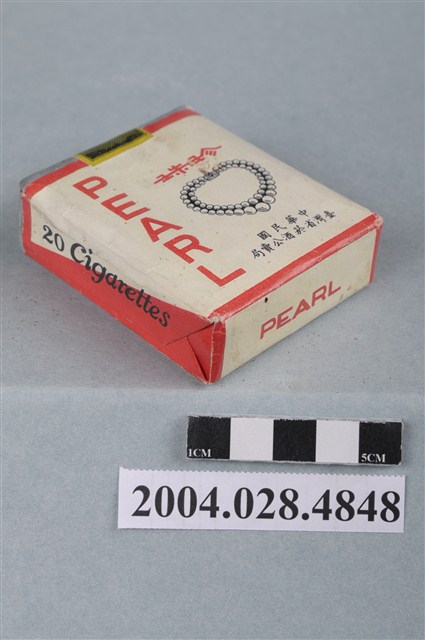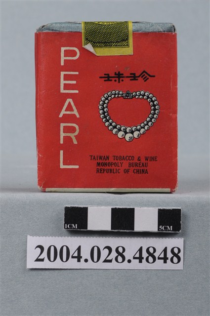 1.本物件為臺灣省菸酒公賣局出品珍珠香煙,為紙盒包裝,為四方體,其主要標示面中,其中一面底為白色,上下有紅色線條於邊緣處,並有「珍珠」、「PEARL」紅色字樣與「中華民國臺灣省菸酒公賣局」黑色字樣,並有珍珠項鍊圖像,另一面底為紅色,並有「珍珠」、「TAIWAN TOBACOO & WINE」、「MONOPOLY BUREAU」、「REPUBLIC OF CHINA」黑色字樣與「PEARL」白色字樣,及有珍珠項鍊之圖像,其側邊則為紅白底色,皆有「20 Cigarettes」字樣,菸盒開封處有黃黑配色紙條黏貼封住,底部則為白色並有「PEARL」紅色字樣。