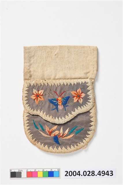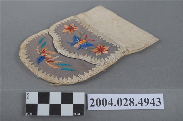 1. 蝶紋客家荷包,此件繡荷包為方形單面單口袋,僅一面有繡紋樣,底布、裡布為米色,蓋布內裡為黑布。繡面部分底布為灰緞,使用米色線做三角鎖邊繡防止布料毛邊。錢包上方的米色布帶是為了能在使用時,把腰帶穿過布帶方便配戴而設計。紋樣方面,蓋布、口袋均以三角鎖邊繡包邊,蓋布繡有蝴蝶,兩側有雙花,口袋部分則繡有花卉紋,主要刺繡技法為緞面繡。蝴蝶的蝴與福諧音,象徵福氣,花卉則有花開富貴之意。