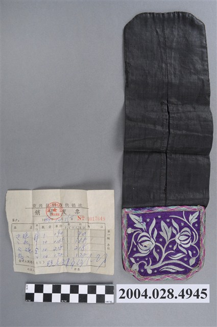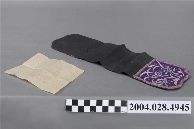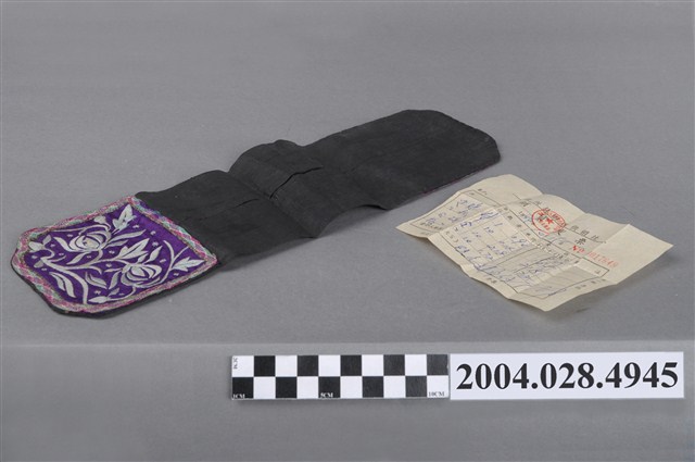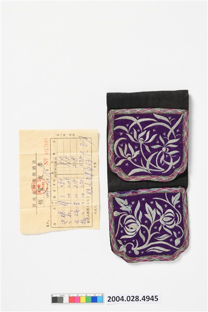 1. 纏枝花紋客家褡褳荷包,此件為雙口袋褡褳,此款褡褳是將兩個紫色口袋分別釘在黑軟帶的兩面兩端,配戴時對折就可以掛在腰袋上,讓兩個口袋朝同面。紋樣方面,雙口袋均使用綠、桃紅、米白色線結邊,增加口袋的耐用度。上方口袋以緞面繡繡有蘭花,蘭花為花中君子,象徵高尚的德行;下方口袋以緞面繡繡有纏枝牡丹,象徵富貴綿延不絕。