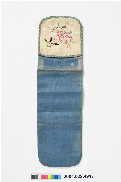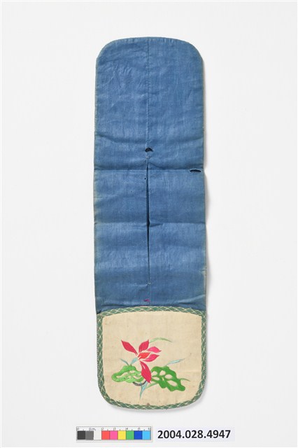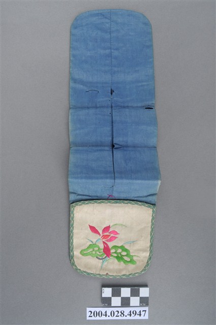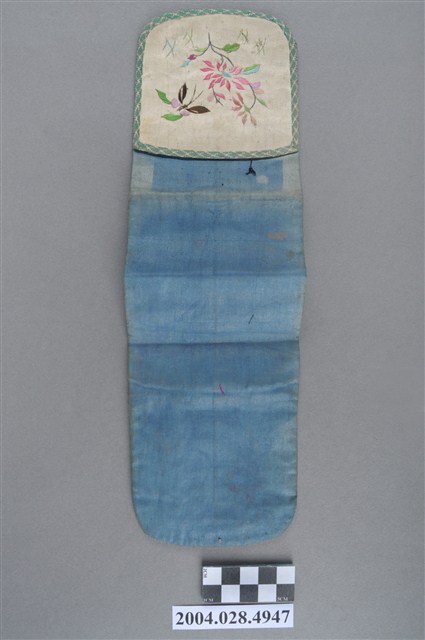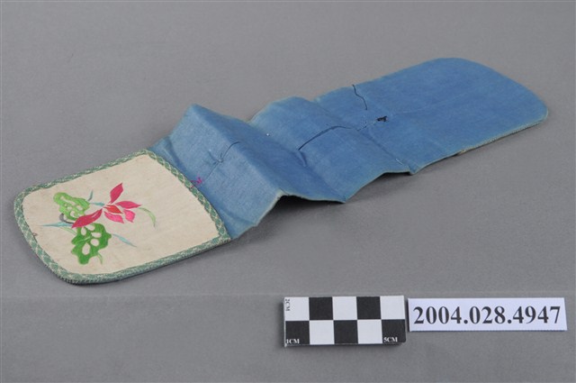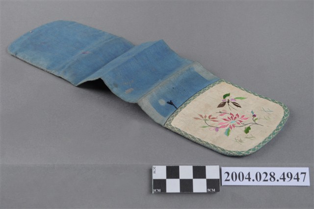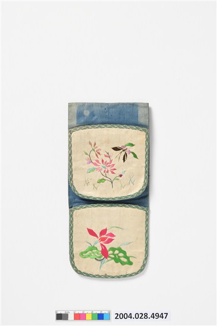 1. 花卉紋客家褡褳,此件為雙口袋褡褳,此款褡褳是將兩個米色緞面口袋分別釘在藍色軟帶的兩面兩端,配戴時對折就可以掛在腰袋上,讓兩個口袋朝同面。紋飾方面,雙口袋均使用藍、米白雙色線做幾何飾邊,加強口袋的耐用度。上方口袋以緞面繡繡有蝴蝶、菊花,蝴蝶的蝴與福諧音,象徵福氣,此外,蝶也與耋諧音,故也象徵高壽,菊花則象徵吉祥長壽。下方口袋以緞面繡做蓮花,蓮花本身代表吉祥,此件荷包傳達對高壽的祝福與追求。