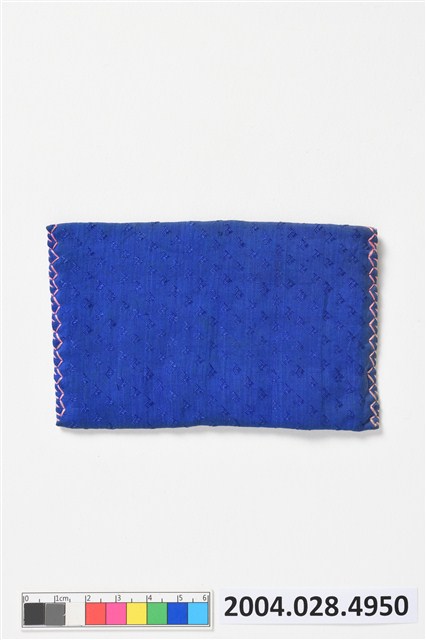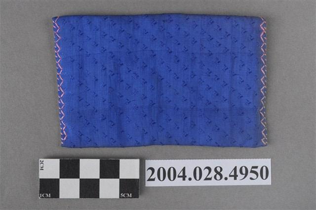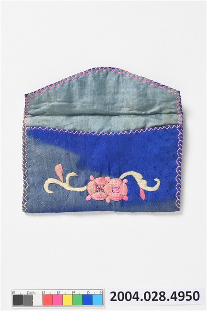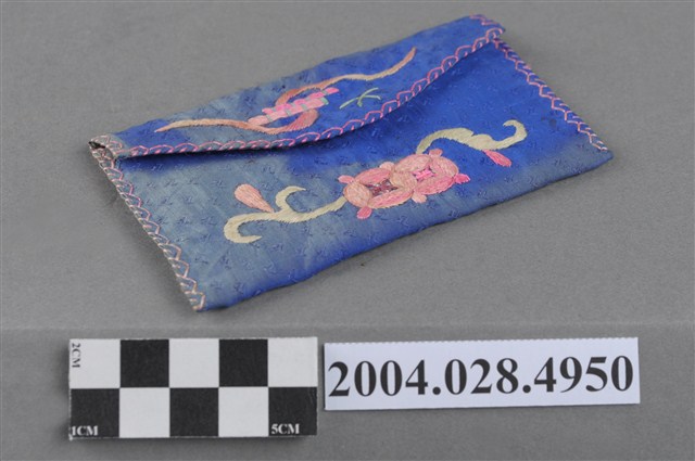1. 藍底緞面繡客家荷包,荷包為方形單面單口袋,僅一面有繡紋樣,裡布為青色,外側布使用有暗紋的藍色緞為底布,周邊用粉色線做幾何結邊,除了粉色與藍色形成搶眼對比之外,還能增加荷包的耐用度。紋飾方面,蓋布繡有竹節,旁邊有竹葉,竹節象徵氣節,也象徵節節高昇;口袋繡有銅錢紋,雙錢與雙全諧音。此件錢包之繡技法以緞面繡為主,使畫面平整秀雅。