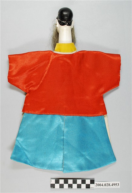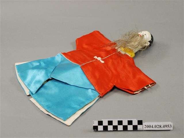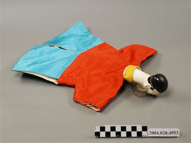 本件保存良好,為布袋戲偶中的頭盔偶慘文,臉部特徵為皺紋鬍鬚,服裝為上紅下藍布衣。頭盔偶為可戴頭盔之戲偶。