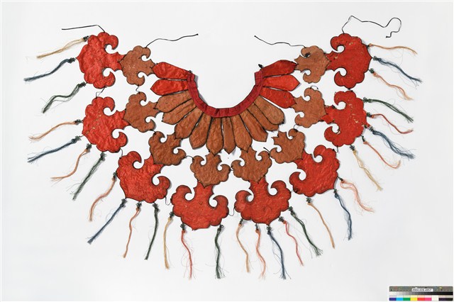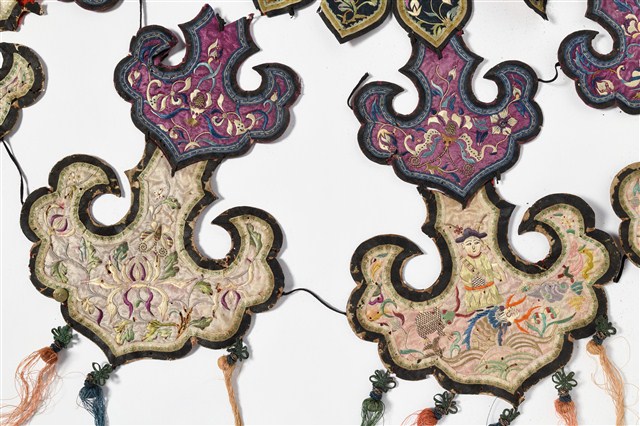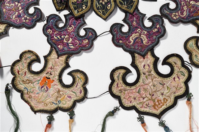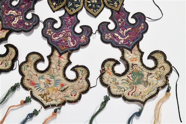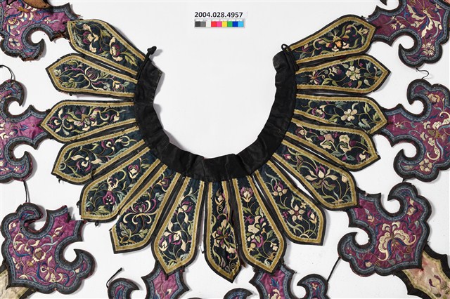 雲肩是由一片或數片繡花布片連綴而成,其用途是隔阻髮膩兼作肩頭裝飾,繡片的形狀通常為如意雲紋形狀,故名雲肩。此為雙層結構雲肩,背面以淺棕色和朱紅色絲綢為底襯,正面共有三個圍次的繡片連綴而成,內圍為十五片柳葉形飾片以黑色絲緞製作,柳葉邊緣以金色織帶裝飾,繡有蝴蝶和四季花卉,花蕊盛開有富貴福祥之意。第二圍以紫色絲緞製成八個如意雲頭造形,最外圍則以米白色絲緞製作八個如意雲頭紋飾片,寓意為八方如意,其上分別刺有人物故事、雙魚寶塔、鰲魚、公雞與鳳凰,鰲為魚身龍頭象徵躍龍門、功成名就,雞有雞冠(諧音官),鳳凰為神獸代表富貴吉祥。領口處則以黑色絲緞製成小立領,搭襯布結紐頭的直布扣,雲肩週圍綴飾珠飾彩繐,使整體繡件更加光彩亮麗、富麗華貴。