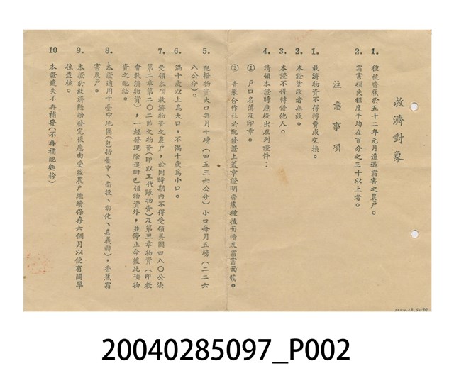 本物件為民國52年劉嘉隆救濟物資配發證,該計畫由臺灣省政府農林廳主辦,是來自美援480公法由美國農友協助臺灣特用作物霜害農戶的救濟物資配發證,從此配發證中可見劉嘉隆住在東勢鎮上城里9鄰東關街214號,家中有11口人,家中種植的1.3公頃香蕉全數遭到霜害,背面註明了救濟對象條件與注意事項。