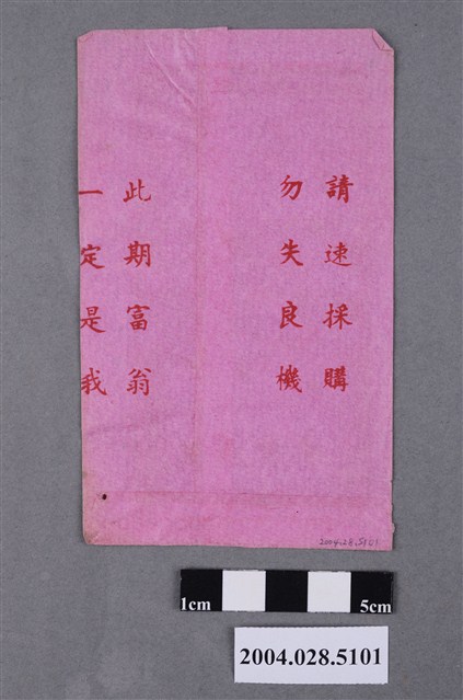1.本物件為天福行祝君中獎封套,為粉紅色紙套,正面中央為4名招財童子吹樂器、舉旗子、推著一車金子的圖案,圖案上下分別有「此期富翁一定是你!!!」及「祝君中獎」紅色字樣,周圍有邊框框中由「卍」填滿,四角各有一「喜」字,左右兩側分別有「(愛國發財)」及「(一舉兩得)」紅色字樣。背面則為「請速採購」、「勿失良機」、「此期富翁」、「一定是我」,四行文字直式書寫。